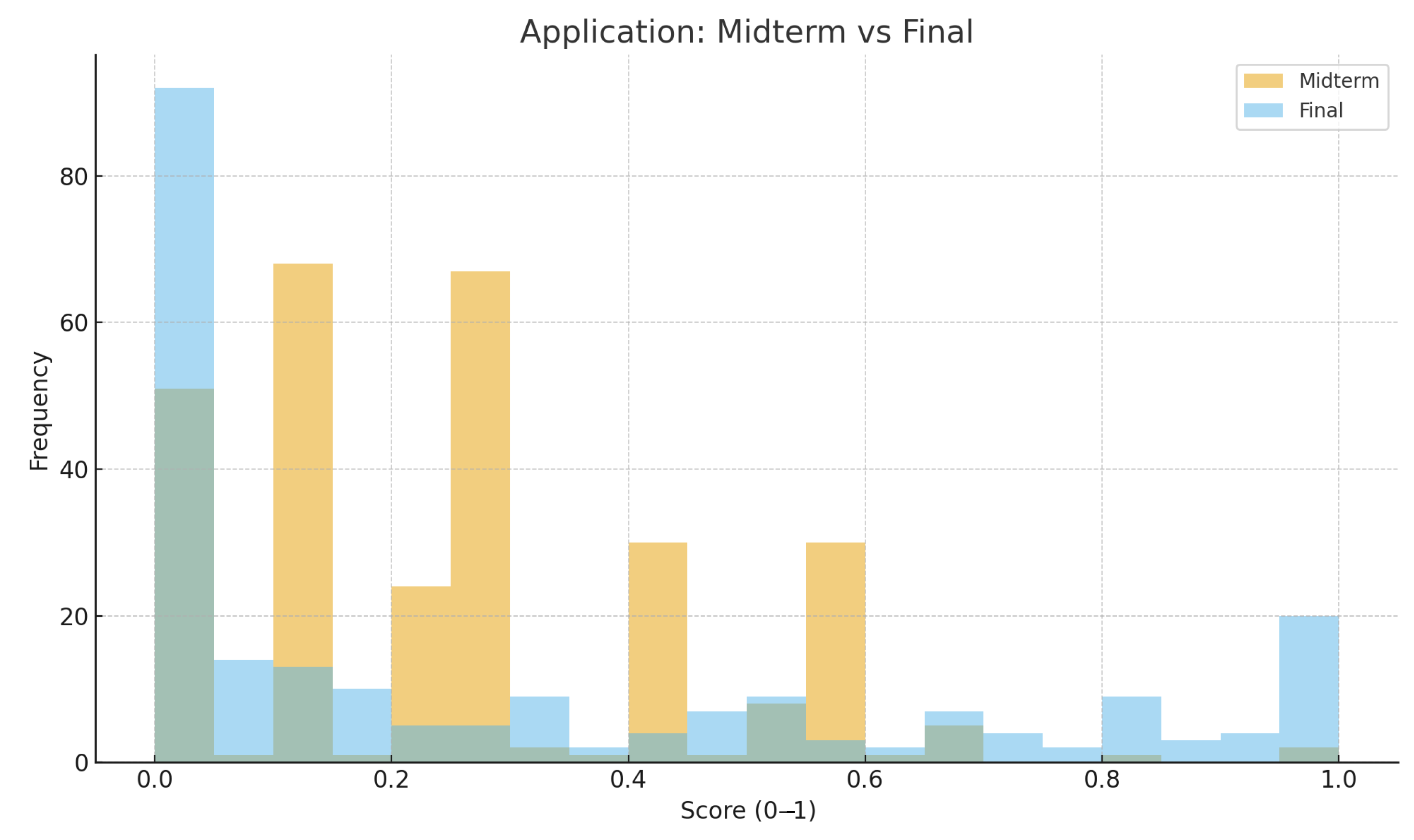 Table 2) reveal distinct trajectories for each cognitive dimension. While differences in understanding and application between midterm and final exams are statistically non-significant (