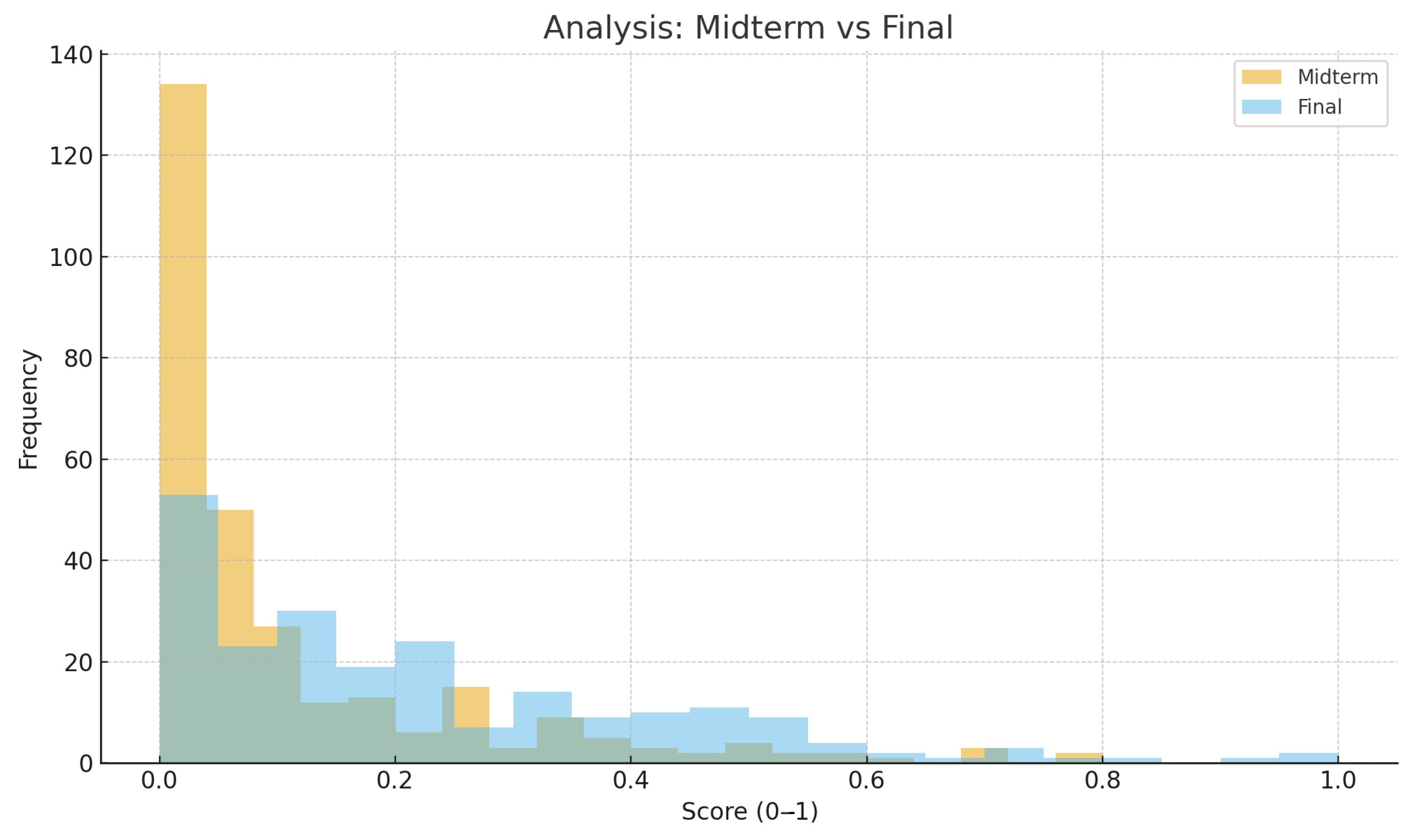 All scores were normalized to a 0–1 range to facilitate cross-group comparison and eliminate grading scale inconsistencies. The dataset contains no missing values for midterm assessments, while approximately 22% of the final exam records are missing, corresponding to students who did not complete the course or did not attend the final exam.
