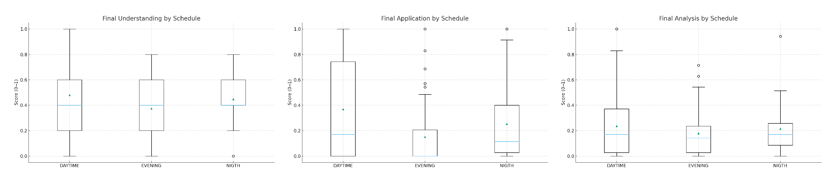 Figure 4 visualizes the distribution of final exam scores across schedules (daytime, evening, and night) for the three cognitive dimensions. The boxplots highlight not only central tendencies but also dispersion and potential outliers, providing a richer understanding of variability in learning outcomes.