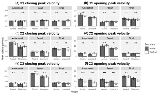 Bar plots with 95% confidence intervals for movement peak velocity (in cm/s) by boundary, accent, and lexical stress conditions during the measured interval: (a) C1 lip closing, (b) C1 lip opening, (c) C2 lip closing, (d) C2 lip opening, (e) C3 lip closing, and (f) C3 lip opening. Asterisks (*) indicate results of pairwise comparisons with the emmeans package [,] based on linear mixed-effects models fitted with the lme4 package [], with Boundary × Accent × Stress as fixed effects and speaker as a random factor in R []. *** = p < 0.001, ** = p < 0.01, * = p < 0.05, tr. = 0.05 < p < 0.06, n.s. = p > 0.06.