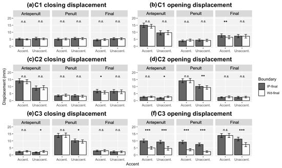 Bar plots with 95% confidence intervals for movement displacement (in mm) by boundary, accent, and lexical stress conditions during the measured interval: (a) C1 lip closing, (b) C1 lip opening, (c) C2 lip closing, (d) C2 lip opening, (e) C3 lip closing, and (f) C3 lip opening. Asterisks (*) indicate results of pairwise comparisons with the emmeans package [,] based on linear mixed-effects models fitted with the lme4 package [], with Boundary × Accent × Stress as fixed effects and speaker as a random factor in R []. *** = p < 0.001, ** = p < 0.01, * = p < 0.05, n.s. = p > 0.06.