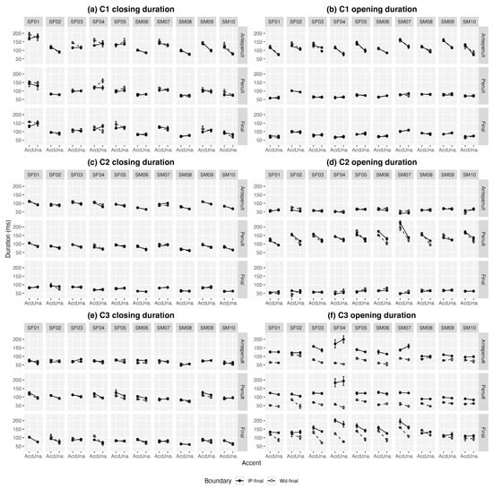 Plots with standard error intervals for ten individual speakers showing movement duration in ms by boundary, accent, and lexical stress conditions during the measured interval: (a) C1 lip closing, (b) C1 lip opening, (c) C2 lip closing, (d) C2 lip opening, (e) C3 lip closing, and (f) C3 lip opening. “F” and “M” in the speaker code stand for female and male, respectively.
