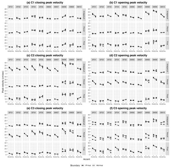 Plots with standard error intervals for ten individual speakers showing movement peak velocity in cm/s by boundary, accent, and lexical stress conditions during the measured interval: (a) C1 lip closing, (b) C1 lip opening, (c) C2 lip closing, (d) C2 lip opening, (e) C3 lip closing, and (f) C3 lip opening. “F” and “M” in the speaker code stand for female and male, respectively.