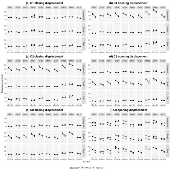 Plots with standard error intervals for ten individual speakers showing movement displacement in mm by boundary, accent, and lexical stress conditions during the measured interval: (a) C1 lip closing, (b) C1 lip opening, (c) C2 lip closing, (d) C2 lip opening, (e) C3 lip closing, and (f) C3 lip opening. “F” and “M” in the speaker code stand for female and male, respectively.