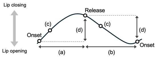 Schematized lip closing and opening movements with kinematic measures: (a) lip closing duration; (b) lip opening duration; (c) peak velocity; and (d) displacement.