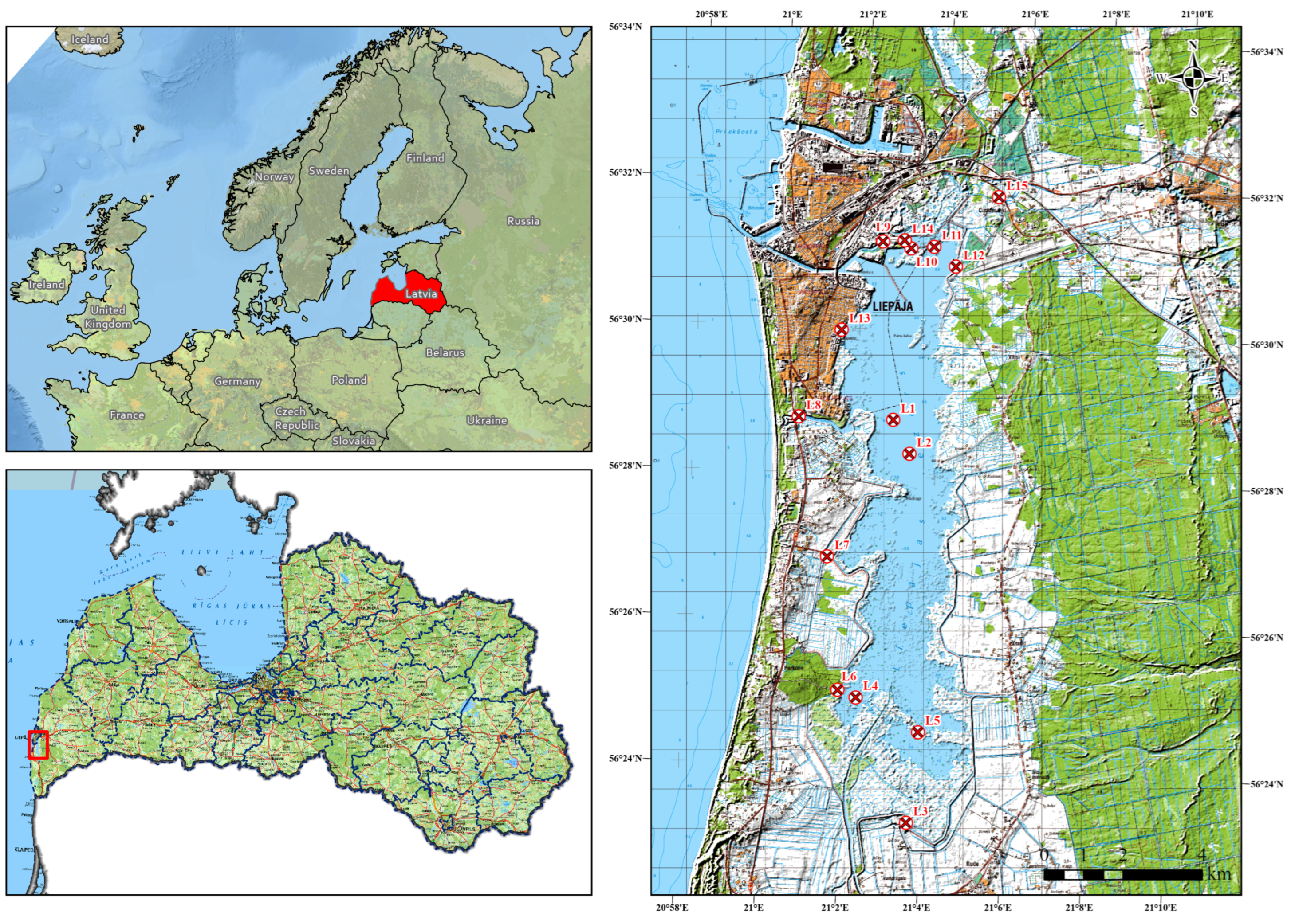 The Liepāja Lake is located in southwestern Latvia (56°23′–56°32′ N, 21°00′–21°06′ E) within the Baltic Lowland (see