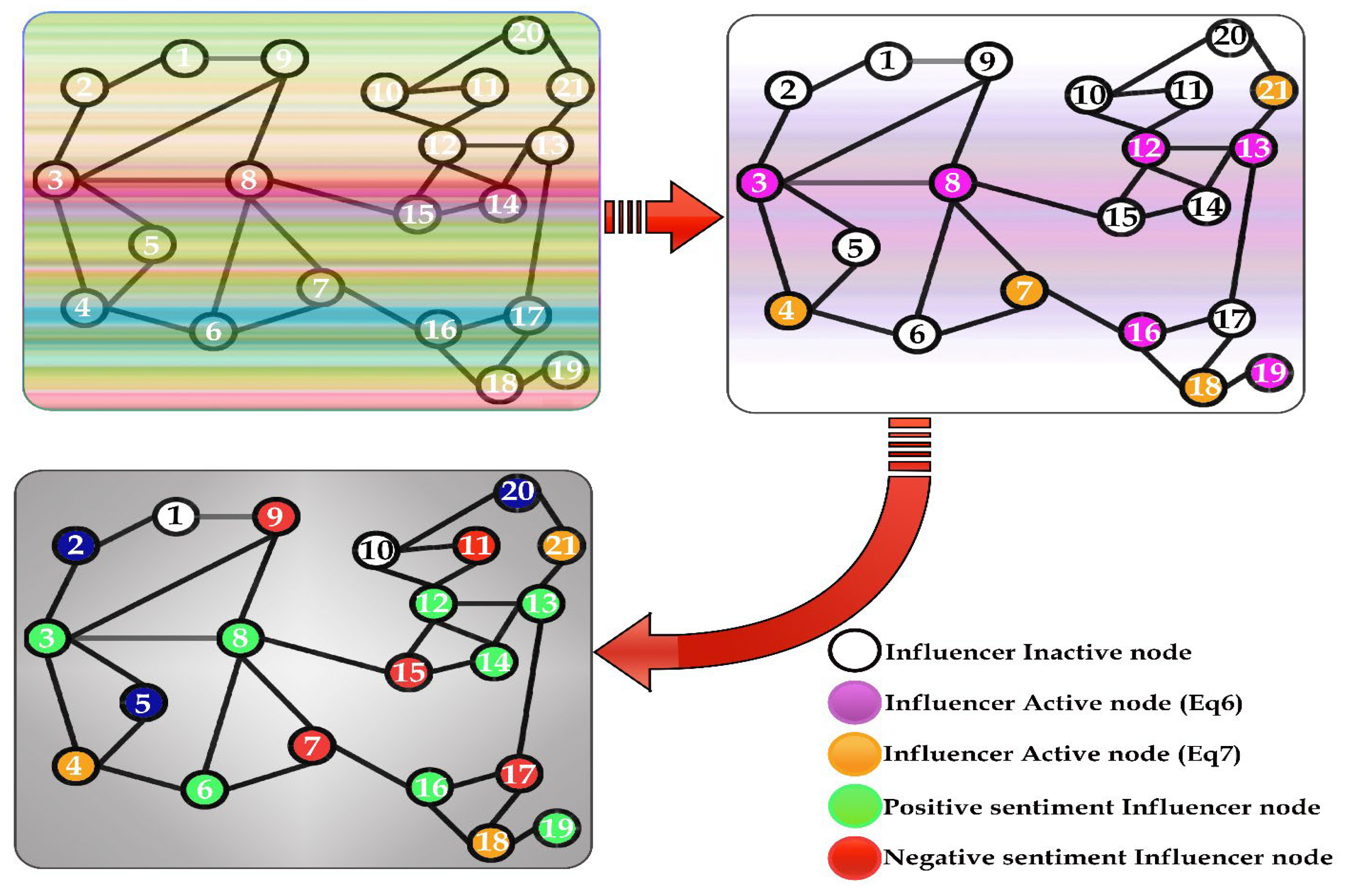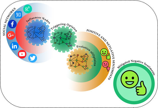 Figure 1. Among the influencer nodes it further identifies the Active and Inactive influencer nodes. Next is the triggering of sentiments formation which separates the negative and the positive influencer nodes; the model will consider only negative influencer nodes. The last stage models the evolving dynamics of negative influencer nodes to shift the sentimental influencer over time and eventually, negative sentiments are in controlled status.
