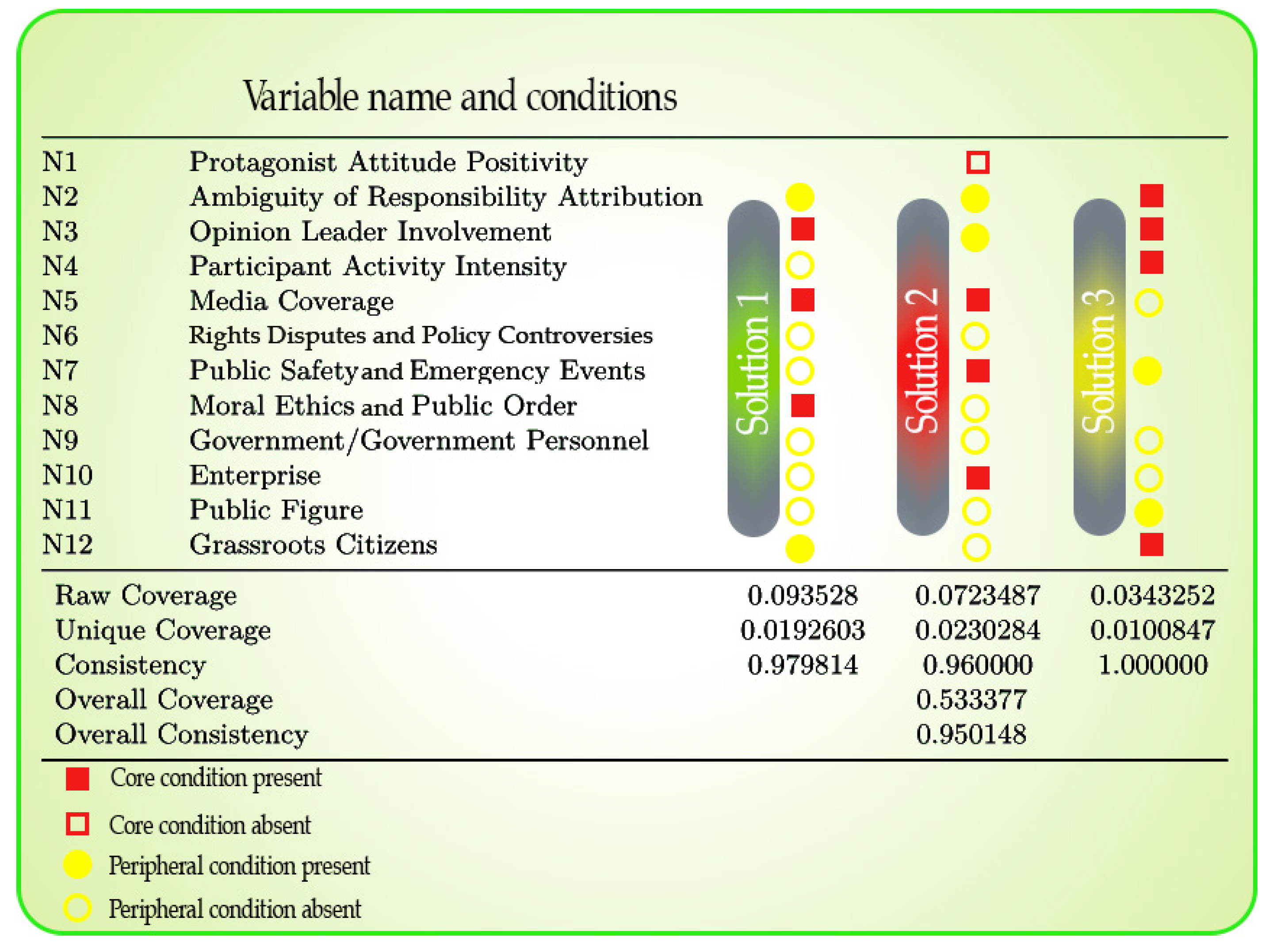 Figure 2, with their respective consistency scores, raw coverage, and unique coverage statistics, demonstrate how conjunctural causality operates in digital sentiment ecosystems. The configurations reveal that viral diffusion emerges through multiple alternative pathways rather than a single universal model, reflecting the heterogeneous nature of information propagation across different event types, audience segments, and platform contexts in contemporary social media environments.