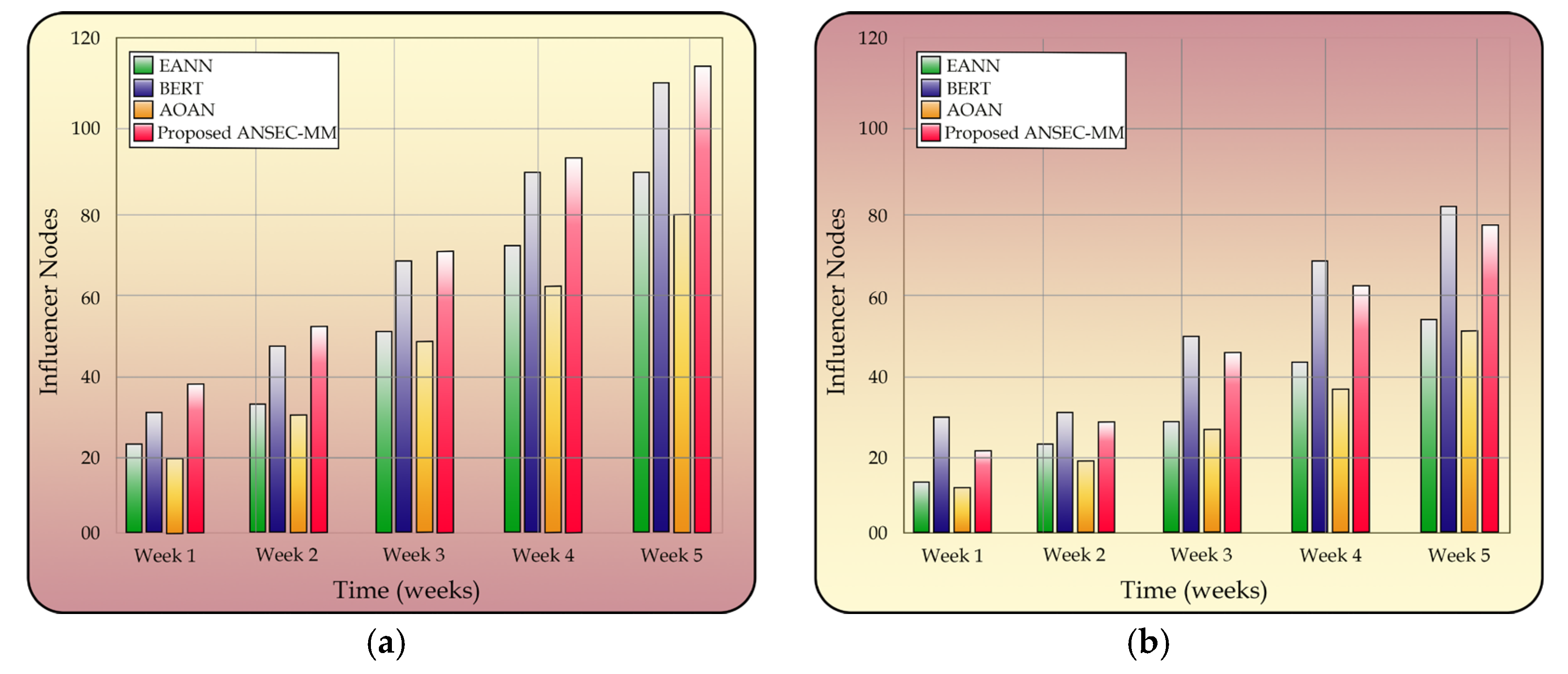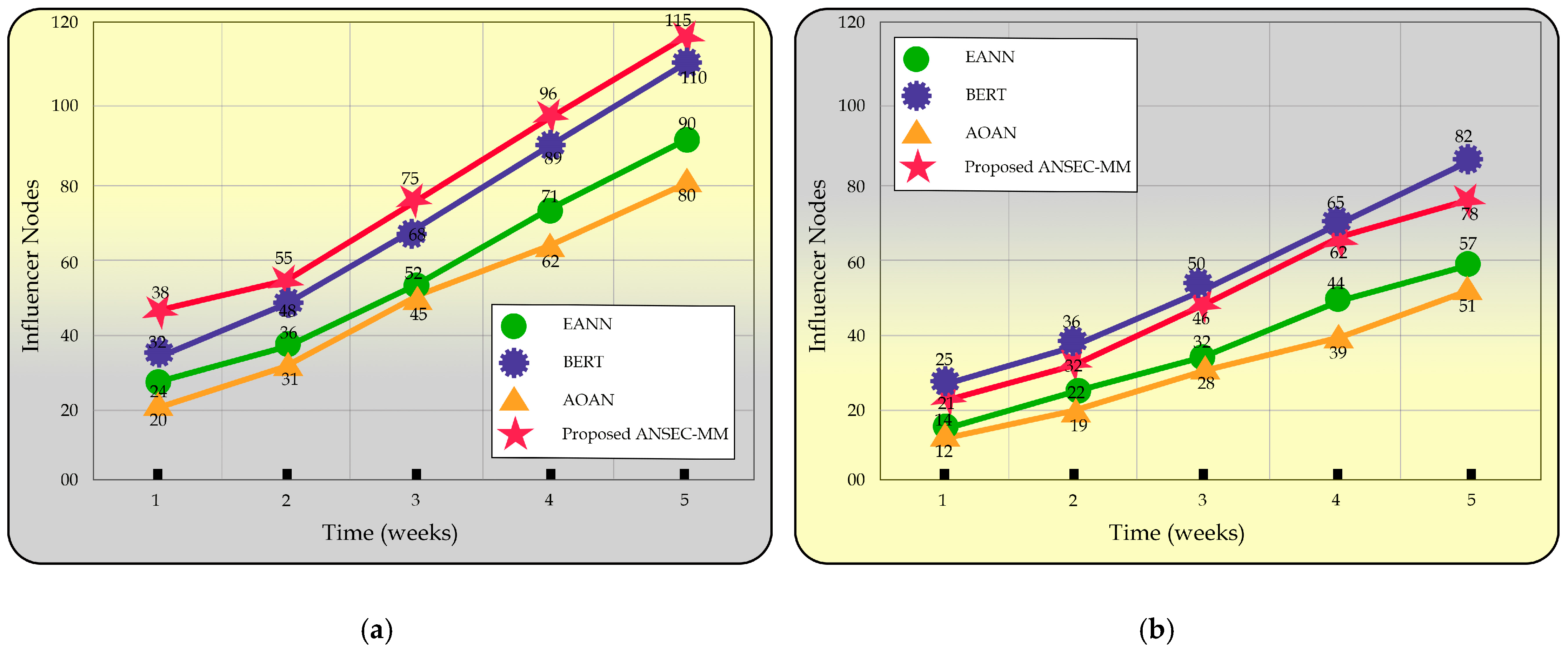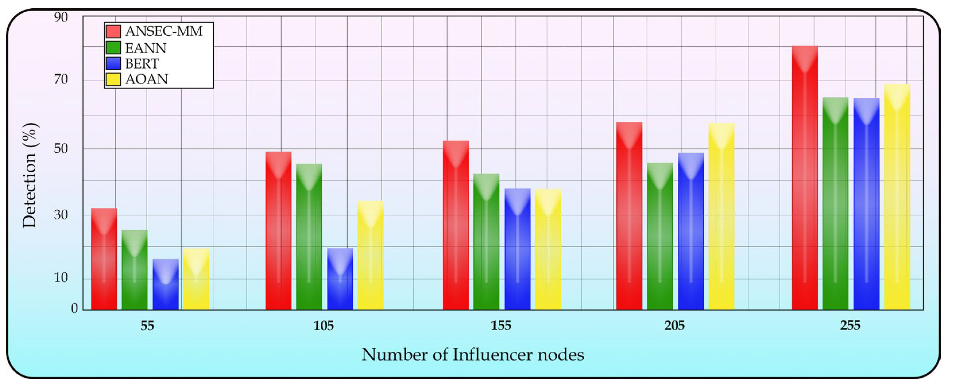 Similarly, with expression capacity ANSEC-MM identified the most influencer nodes (110), showcasing its superior detection capability, while BERT also performed strongly (102 nodes) depicted in