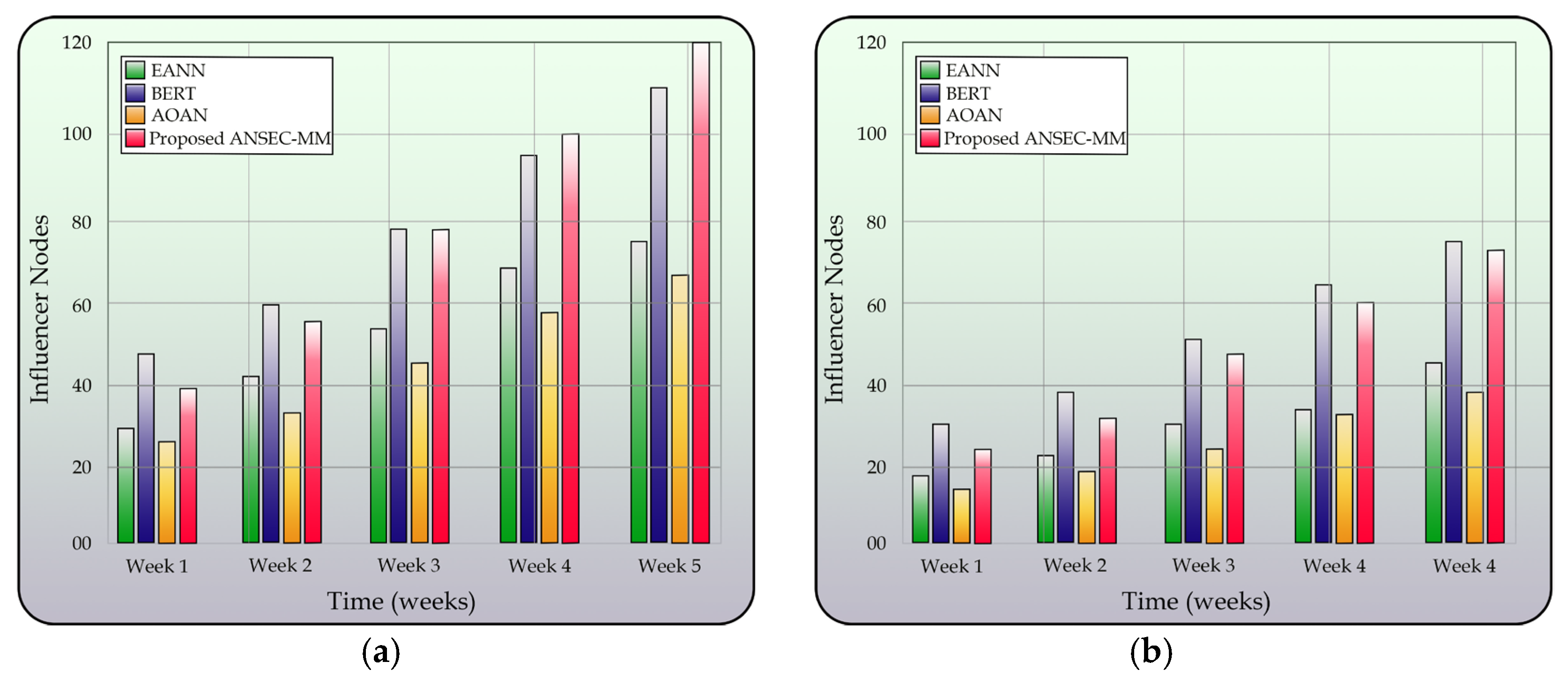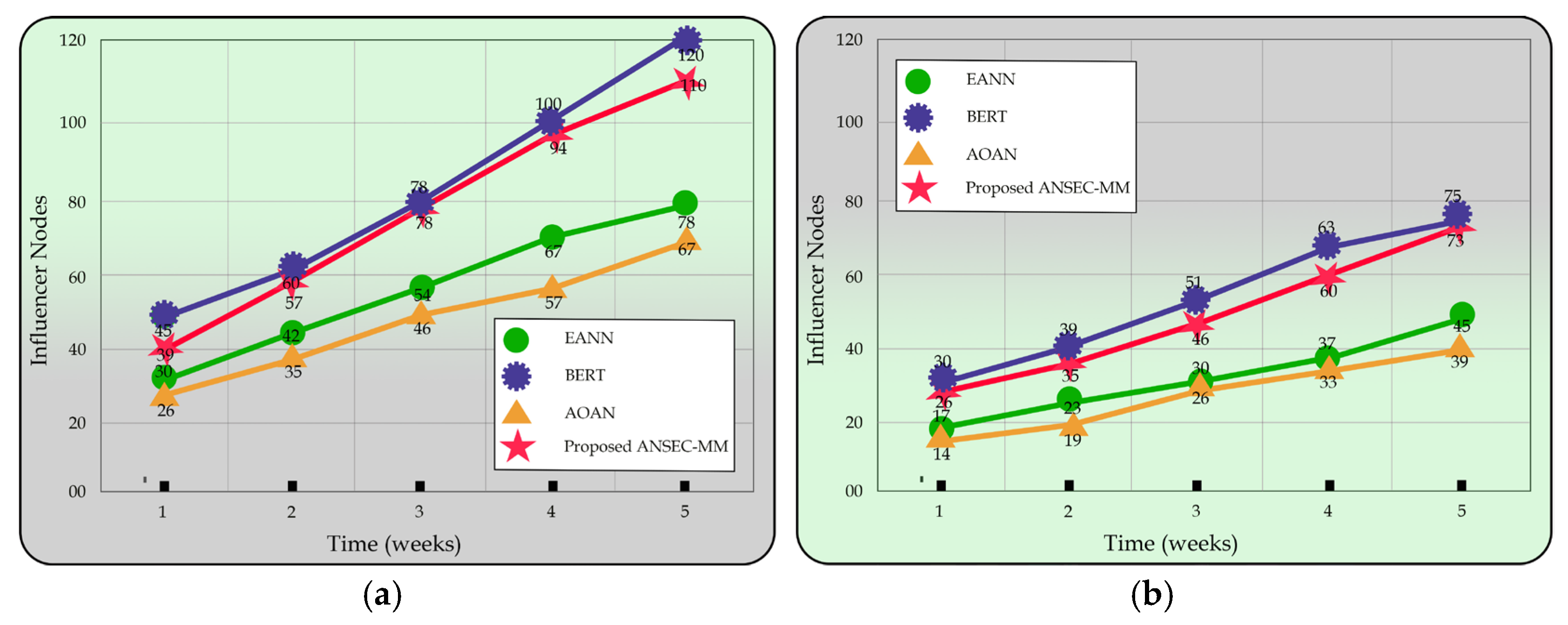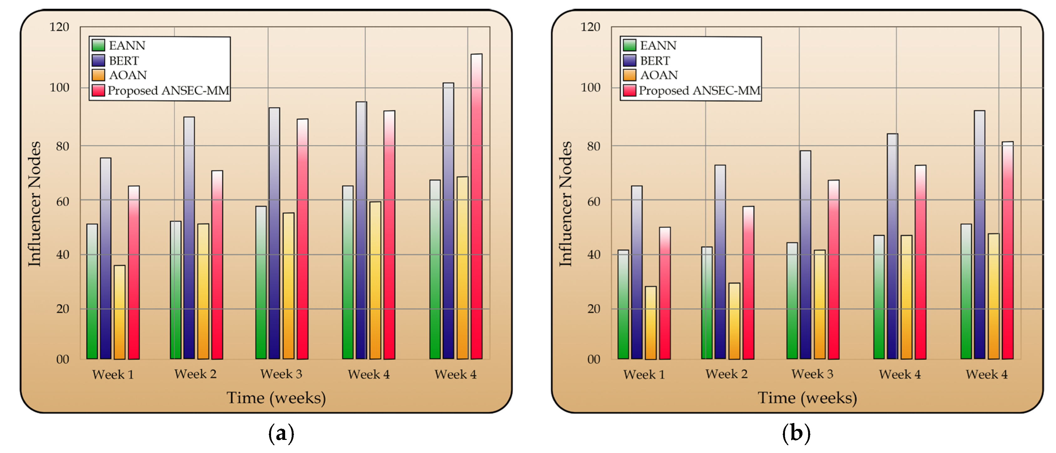 Similarly, with expression capacity ANSEC-MM identified the most influencer nodes (110), showcasing its superior detection capability, while BERT also performed strongly (102 nodes) depicted in