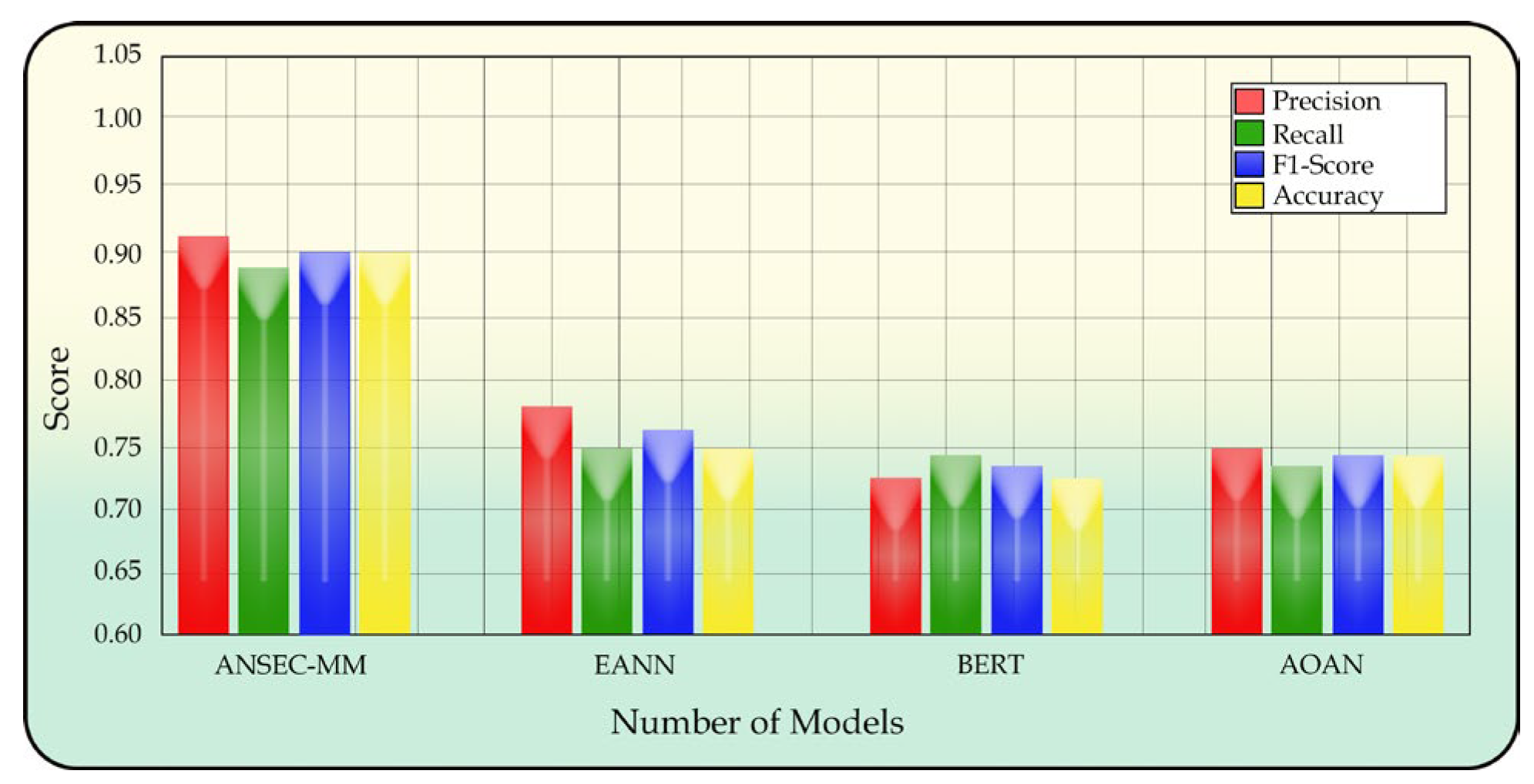 Figure 5a, with expression capacity, ANSEC-MM achieved the highest performance (0.93), followed closely by BERT (0.90), demonstrating the value of specialized design and advanced language modeling. The outcome without expression capacity depicted in