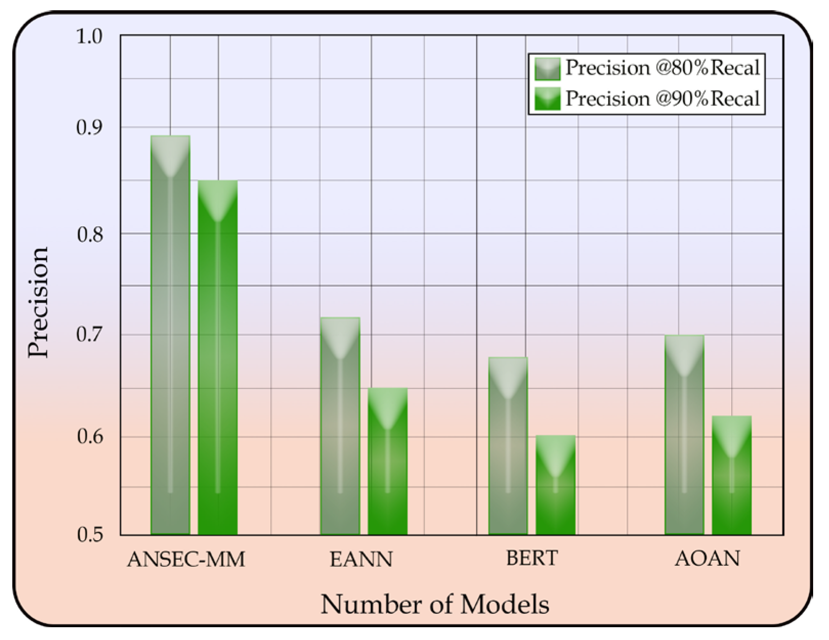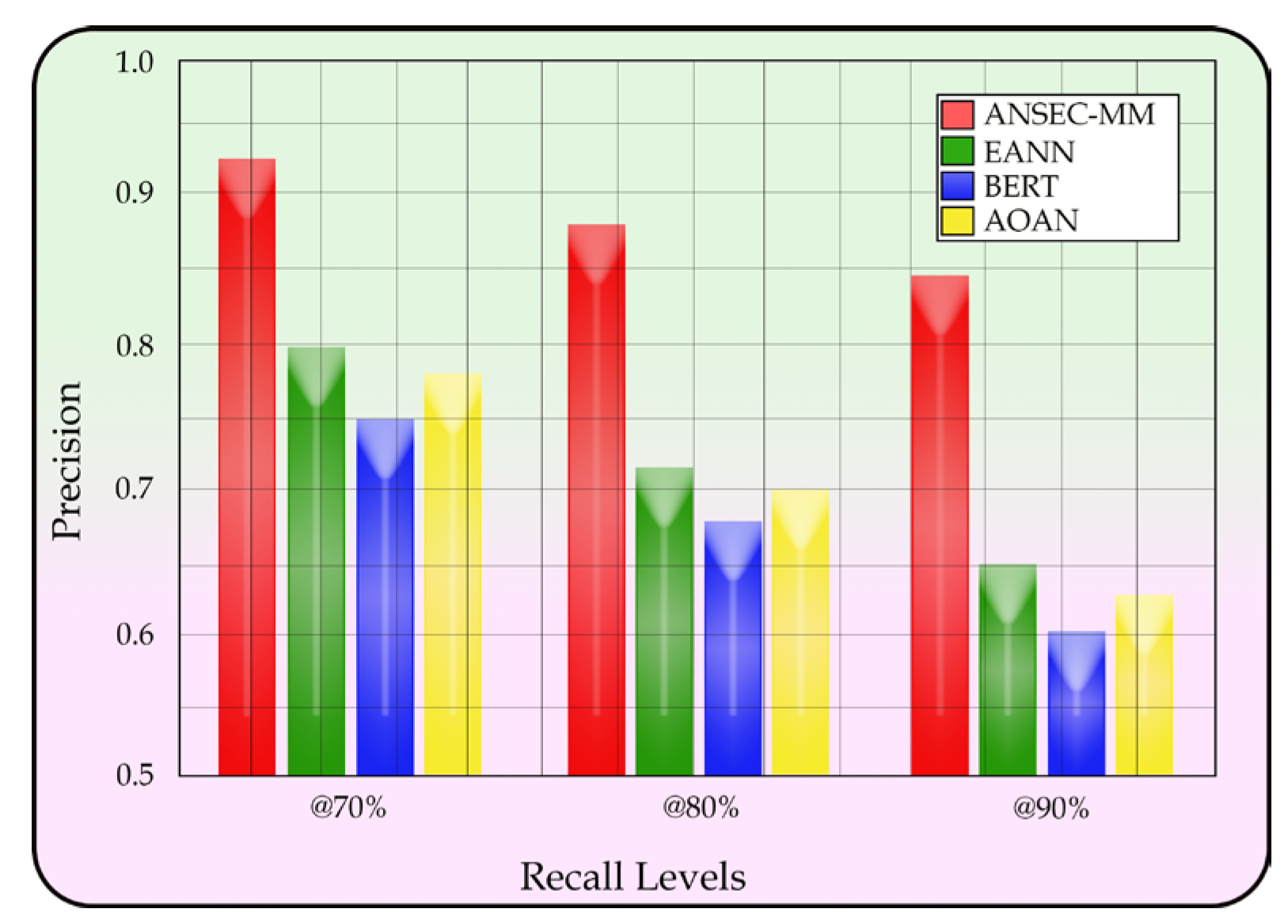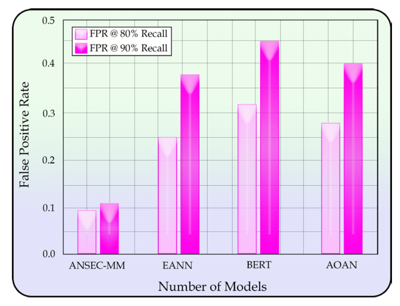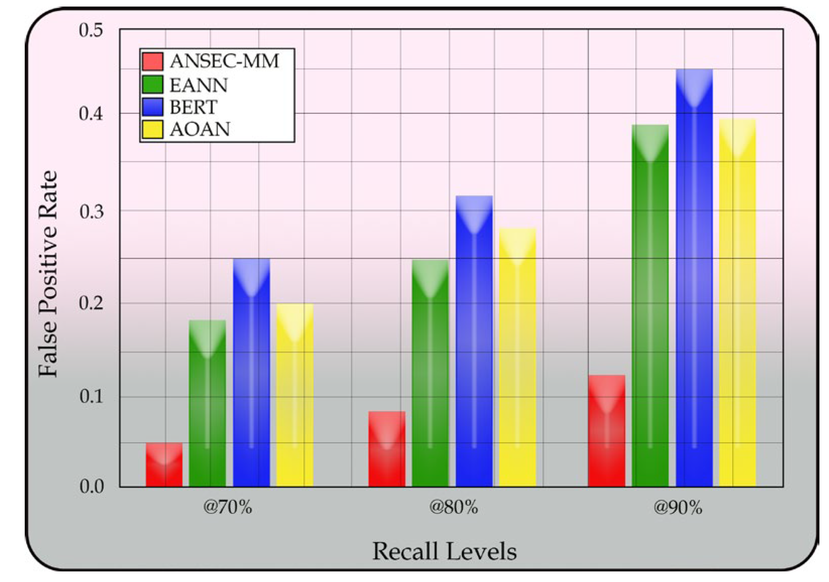 Figure 13. At 90% recall, ANSEC-MM achieves an FPR of only 0.12, significantly outperforming baseline models. This indicates robust discrimination capability while maintaining high sensitivity in negative sentiment detection.