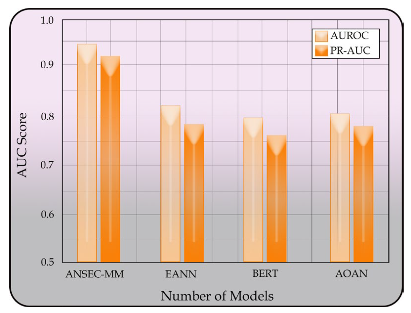 Figure 14. At 90% recall, the proposed model achieved 0.85 precision, significantly outperforming baseline methods that suffer substantial precision degradation. This consistent performance across recall levels highlights the robustness of model in negative sentiment identification while minimizing false positives. At the same time, AUC evaluation revealed the exceptional discriminative power of ANSEC-MM with 0.94 AUROC and 0.92 PR-AUC, substantially exceeding all comparative models illustrated in