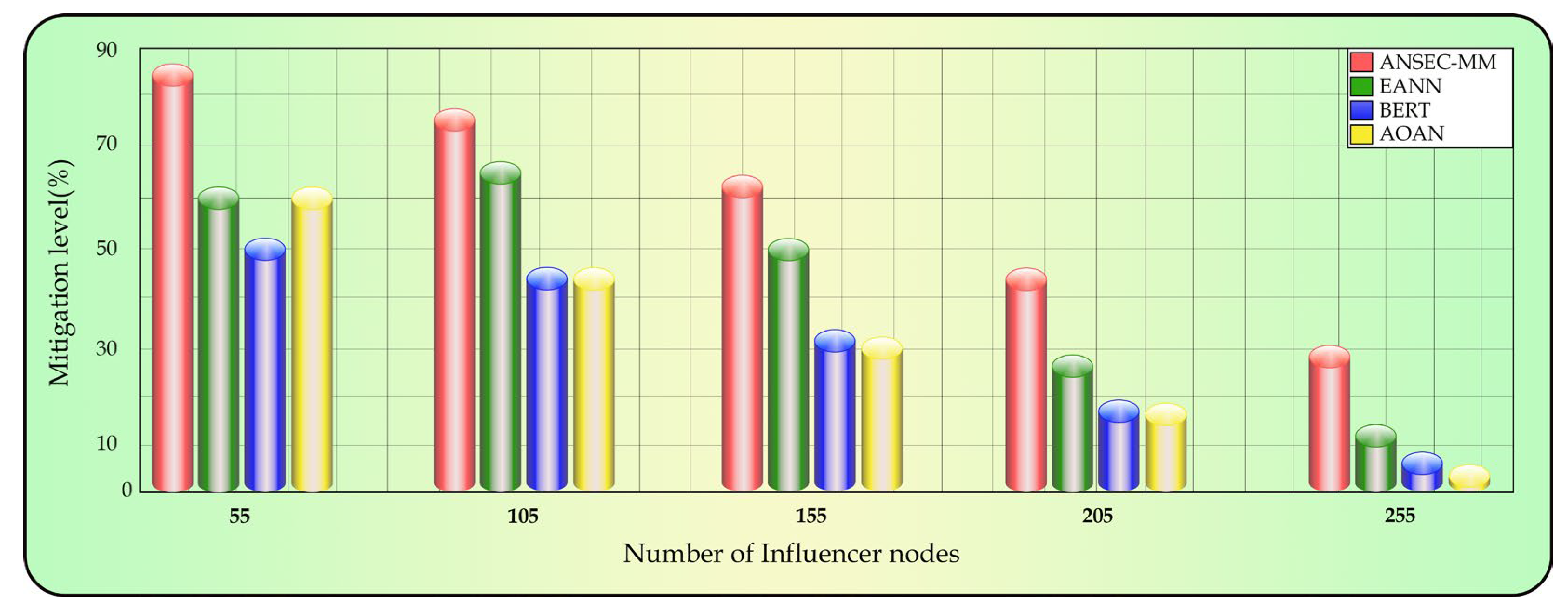 Section 4.1. This could only be possible because ANSEC-MM bolstered the mainstream network credibility and monitored the likelihood during the dissipation phase. The expression capacity accounts for the likelihood of influencer nodes that become inactive in spreading opinions. This exhibits the dynamic behavior of influencer nodes and considers factors such as user personality and event to better consider and mitigate the spreading of unusual behavior of the users within the network. The performance of BERT and AOAN from node 105 to 205 almost remained synchronized because BERT tried to strengthen the monitoring and promoted evidence-based judgment to rebuild the trust level while AOAN restricted the negative content through platform rules to reduce emotional spread. At 255 influencer nodes, the proposed model was still active to mitigate the negative sentiments up to 30% whereas rest of the approaches were residing below 10%.