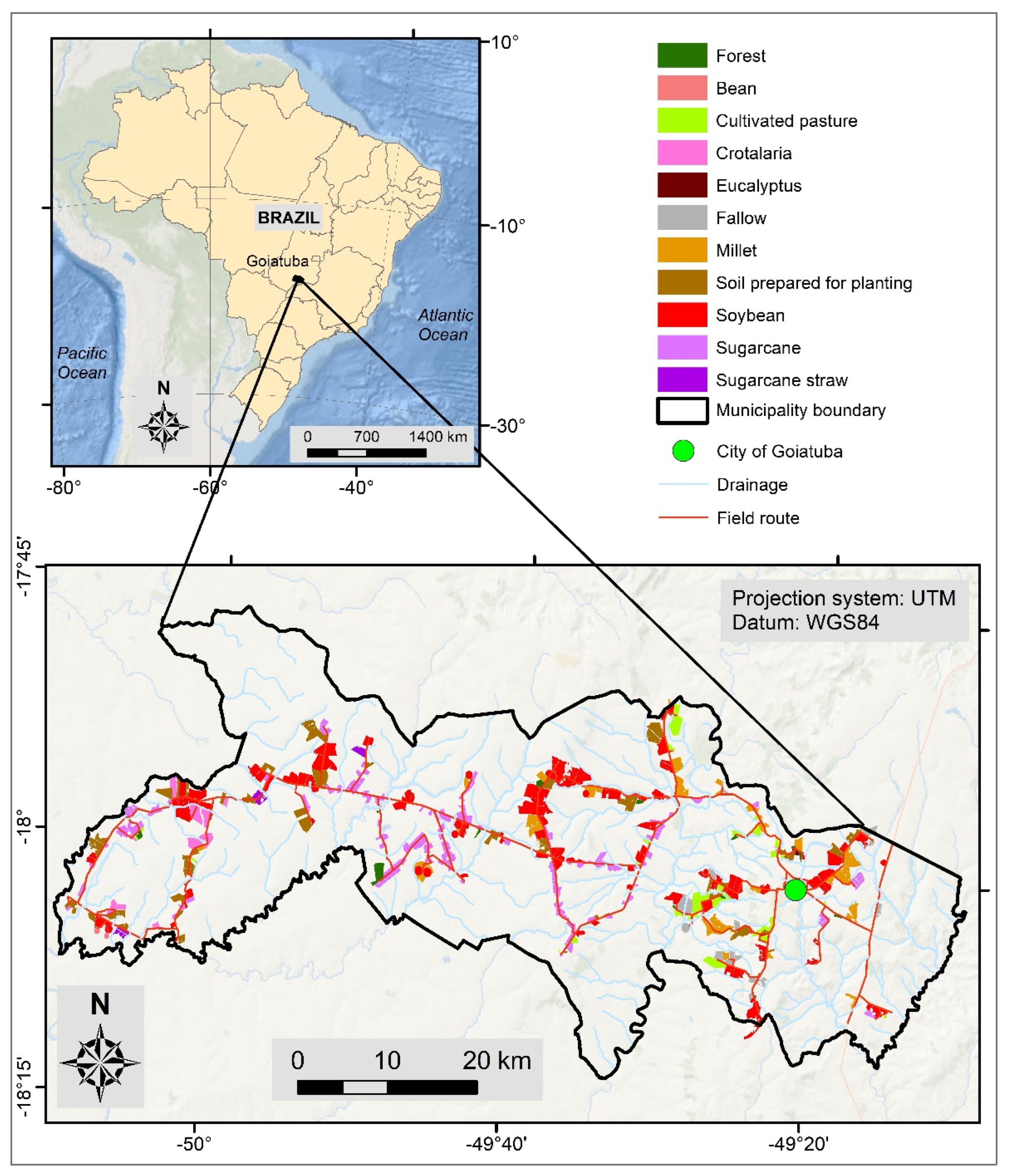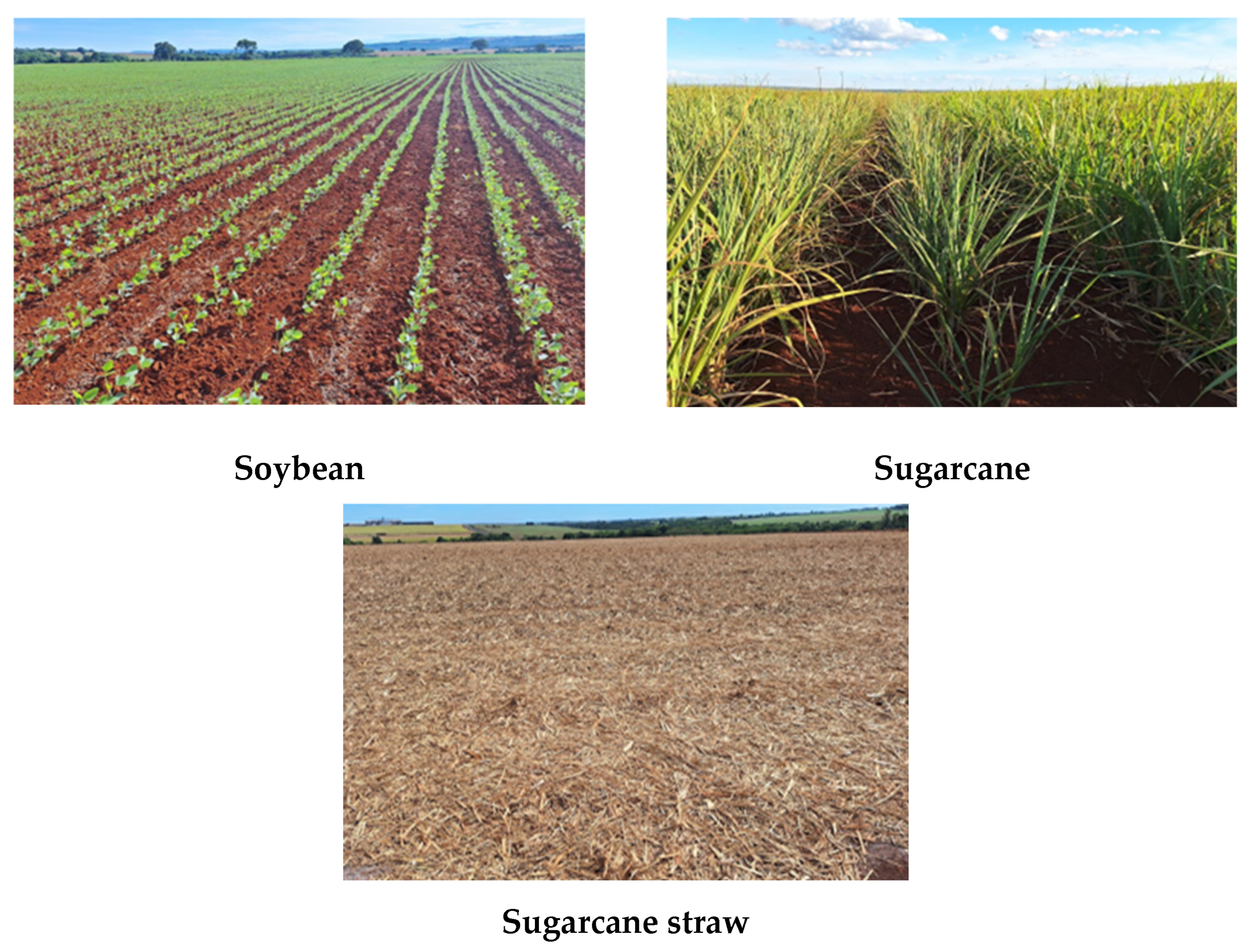 - Santana, B.S.F.; Amaral, F.G.; Cruz, C.B.M. Spatial analysis of soybean and sugarcane monocultures in the Goiás landscape. Anu. Inst. Geocienc. 2022, 45, 44825. [Google Scholar] [CrossRef]