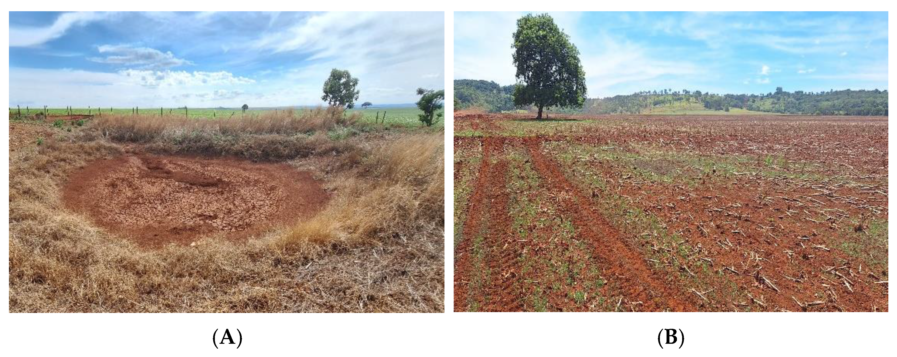 - Costa, R.A.; Santos, F.O. Expansão agrícola e vulnerabilidade natural do meio físico no sul goiano. Geogr. Atos 2010, 10, 23–35. Available online: https://revista.fct.unesp.br/index.php/geografiaematos/article/view/270/pdf (accessed on 6 December 2025).