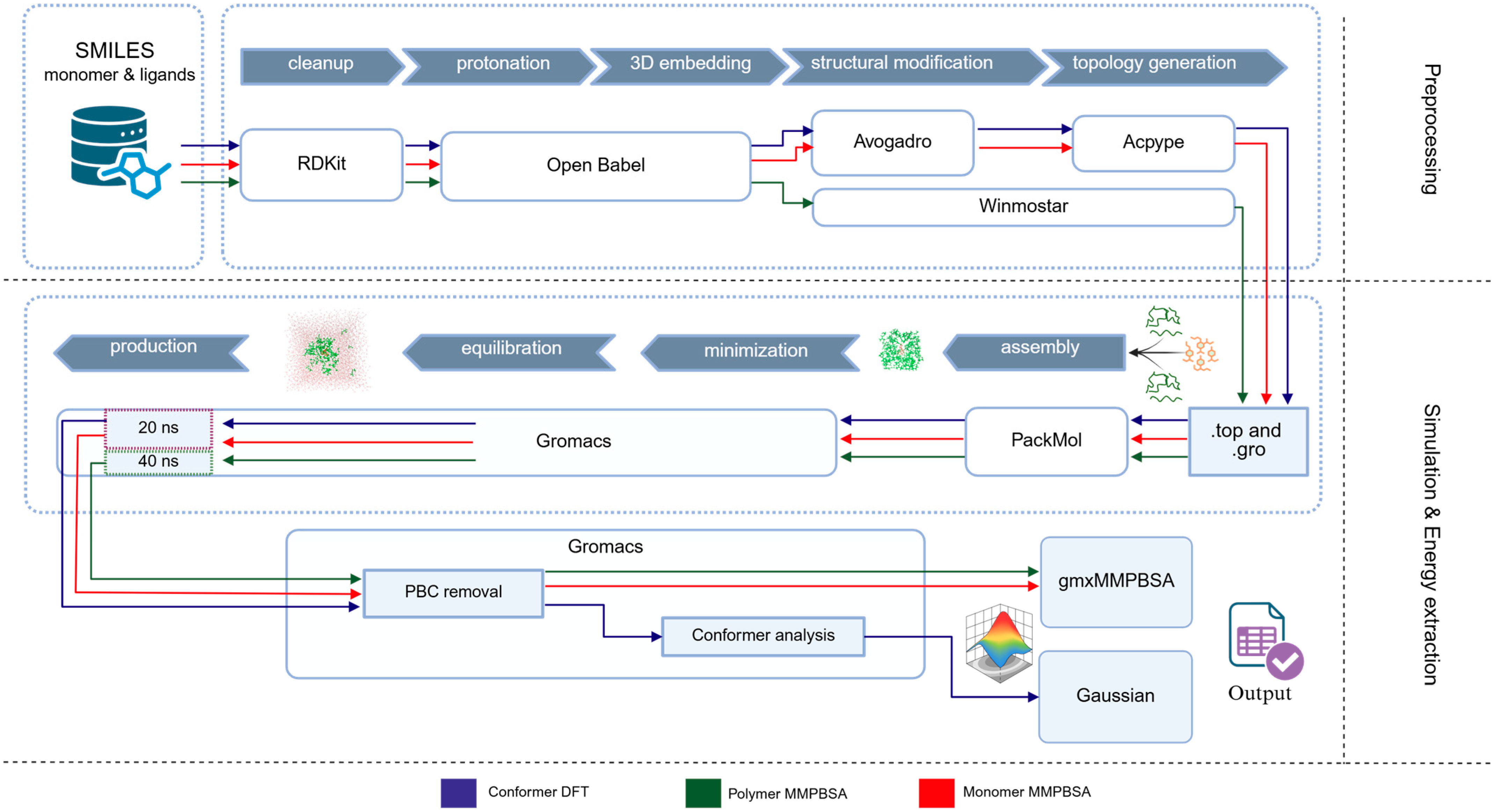 We generated two related MD datasets describing polymer–pharmaceutical interactions (see the Data Description section). Both datasets were produced using an integrated computational workflow for molecular preparation, simulation, and analysis, summarized in