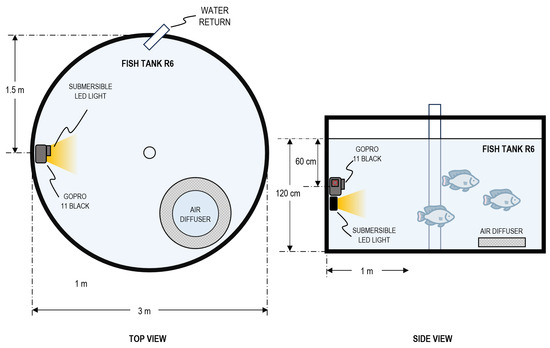 The dataset was collected at Granja la Familia Tilapia, a commercial facility located in Querétaro, Mexico (20.5551° N, 100.2561° W). The facility is located at an altitude of approximately 3360 m above sea level. The farm employs a recirculating aquaponic system that integrates tilapia farming with hydroponics in a semi-controlled environment (Figure 1). The system comprises four large tanks of 80,000 L and six smaller tanks of 8000 L, all hydraulically connected within greenhouse structures to ensure environmental stability. The cylindrical grow-out tanks considered in this study had an approximate water depth of 1.20 m. System components include mechanical filters for solids removal, biofilters for ammonia-to-nitrate conversion, aeration units, water pumps, and hydroponic grow beds. These features reproduce real aquaculture conditions, including organic waste, turbidity, and suspended particles that challenge underwater vision.