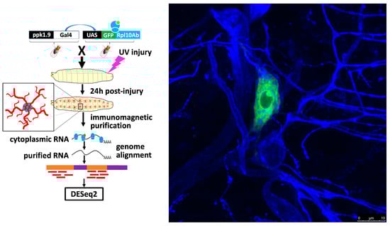Using the Translating Ribosome Affinity Purification approach (see Figure 1), we isolated mRNA from the primary nociceptors of third-instar Drosophila larvae 24 hours after UV injury, at which point they experience peak allodynia [,,]. We hypothesized that transcriptional/translational responses to injury lead to the process of nociceptive sensitization and/or recovery from sensitization. Building on our prior research in nociceptive sensitization using fly larvae, we believe that further investigation into the mechanisms of its development and recovery will deepen our understanding of the complete nociceptive sensitization mechanism and reveal new targets for chronic pain drug development.