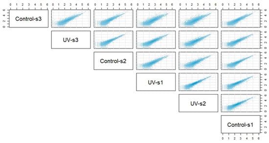 Pairwise scatterplots revealing intra-/inter-sample relationships. Sample gene counts from nociceptor transcripts were log10-transformed in R and were analyzed for quality and inter-/intra-relationships by pairwise scatterplots of all samples in both groups (Control vs. UV-injured). Each dot within the scatterplot represents a gene, and the mean expression of that gene between the two samples shown by its x-y coordinate placement. n = 3 (pooled samples)/group (Control vs. UV-injured).