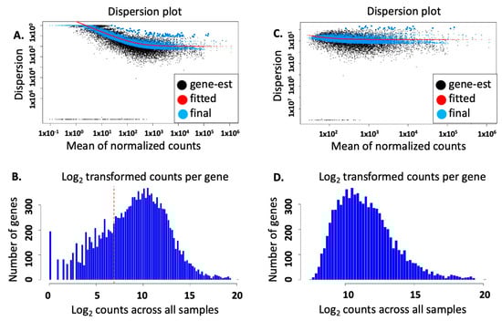 The ‘estimateSizeFactors’ function in DESeq2 was carried out to control for differences in library sizes using the “median-of-ratios method” [,]. Inter-/intra-relationships among groups and sample quality were visualized by pairwise scatterplots of all samples in both groups (Figure 2) in R, using count data normalized by log10 transformation []. Read count distribution and the potential high magnitude of low read counts was investigated through visualization of a histogram of the sum of log10-transformed count data across all samples, also in R (Figure 3B,D) [,]. The DESeq2 function ‘estimateDispersions’ was then used to calculate dispersion estimates across genes for all samples and visualized with the DESeq2 dispersions plot (‘plotDispEsts’) (Figure 3A,C). After preliminary analysis of the count data for low expression, we set a custom threshold of at least 20 counts per six samples via the following code written in R and applied it to the dds object within the DESeq2 pipeline []: ‘keep <- rowSums(counts(dds, normalized=TRUE) >= 20) >= 6’ ‘dds <- dds[keep,]’.