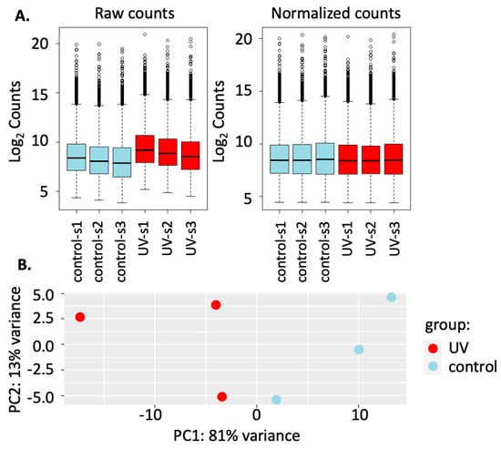 After counts had been thresholded to eliminate sparsely expressed genes, the DESeq output was visualized for sample clustering analysis using DESeq-normalized data and the principal components plot function (Figure 4) found within the DESeq2 package []. Sequencing depth is indicated in Table 1.