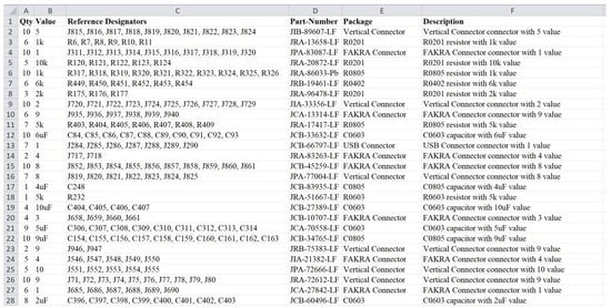 Example of a BOM structure. Each row corresponds to a unique component, with columns specifying its characteristics.
