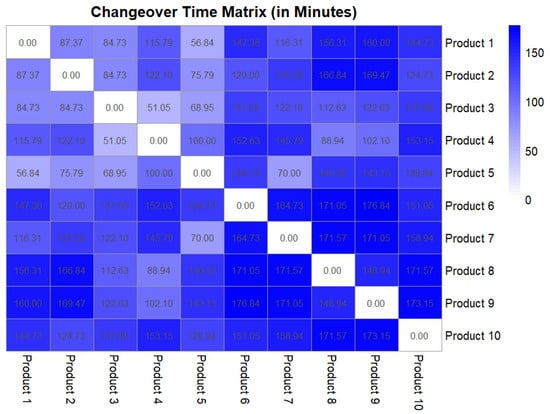 - A cumulative changeover time of 1014 min for the optimal product sequence, representing a substantial reduction compared with traditional scheduling approaches.