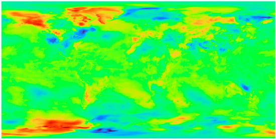 We applied the outlined procedure to various meteorological variables, yielding comparable results. However, one of the pivotal influencers on temperature fluctuations is alterations in the land conditions, manifesting as deforestation, shifts in land utilization, and related factors. Our computations for the targeted variables were grounded in data from Winkler et al. [59], organized in a 1° × 1° grid. This dataset not only encapsulates the evolution of land cover over different years but also delineates the shifts between distinct plant covers, namely (1) Urban, (2) Cropland, (3) Pasture, (4) Forest (Unknown/Other), (5) Forest (Evergreen, needle leaf), (6) Forest (Evergreen, broad leaf), (7) Forest (Deciduous, needle leaf), (8) Forest (Deciduous, broad leaf), (9) Forest (Mixed), (10) Grass/shrubland, and (11) Sparse/no vegetation. The global vegetation cover in 2019 is depicted in Figure 3; our focus, however, lies in elucidating how a specific vegetation type in a given year transforms into a different kind in the subsequent year. We accomplished this analysis utilizing the transfer data available in the database, where 11 vegetation types can transition in 121 possible ways. Over the past five decades, most of these transitions occurred from Pasture to Forest (Deciduous, broad leaf). To illustrate, we present the case of this specific transition, employing the MATLAB programming language in Figure 3.
