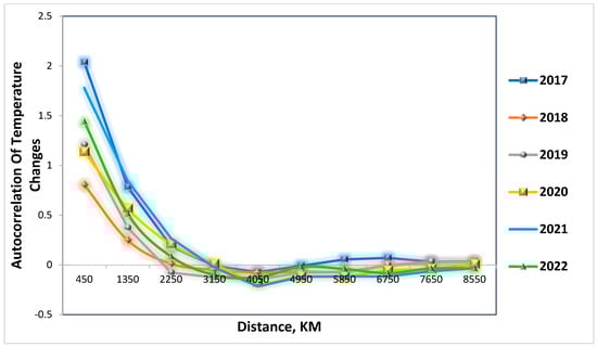 Employing satellite maps delineated in Table 1, we harnessed diverse variables with varying grid structures and temporal scopes. The regional correlation in temperature change is shown in Figure 1, giving rise to two essential questions that must be addressed for confirmation: 1. Has the temperature genuinely experienced regional fluctuations? 2. What is the extent of this regional area? To address these questions, we employed the non-parametric spatial correlogram method [64] shown in Figure 2. This figure indicates that regions within a proximity of approximately 2000 km have undergone concurrent temperature fluctuations. In contrast, those within this range either exhibited no mutual influence or demonstrated adverse impacts on each other.