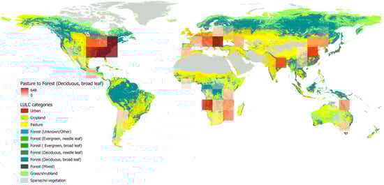 Global map for land cover. The illustration consists of two components. The initial segment comprises regions featuring 1000° × 1000° grids, depicting the transition from Pasture to Deciduous, broadleaf forest. The second segment displays the Earth’s vegetation cover in the year 2019. By considering a grid with dimensions of 1000° × 1000°, we quantified the occurrences of the transition from Pasture to Forest (Deciduous, broad leaf) in 1° × 1° grids. The corresponding count graph is highlighted in red. Notably, regions with a deeper shade of red indicate a higher frequency of the mentioned transition. By employing this method, we can ascertain the extent of transfers in an area of approximately 1110 by 1110 square kilometers. These calculations were systematically applied across all 121 possible states of land cover changes.