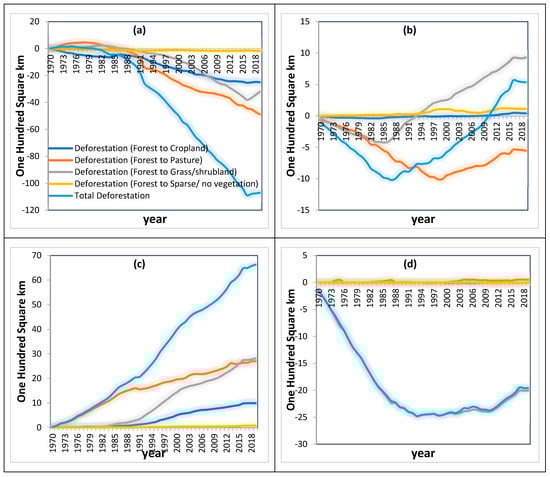 After evaluating transfers across 121 states, we computed the net transfer rates for each state. For instance, the net transfer from Forest (Deciduous, broad leaf) to Pasture is determined by subtracting the transfer from Forest (Deciduous, broad leaf) to Pasture from the transfer from Pasture to Forest (Deciduous, broad leaf) in a specific year and region. Positive transfer values signify an overall transition from Forest (Deciduous, broad leaf) to Pasture, whereas negative values indicate the opposite. The analyzed data present the variations in forest coverage across different years. To obtain a comprehensive view of the trends in forest changes over these years, we performed cumulative calculations of these changes annually, aiming to discern the trend patterns in the variations within the vegetation cover across different regions.