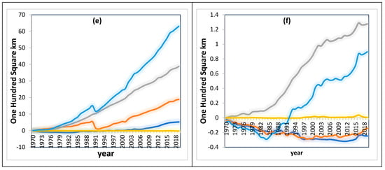 (a) Transformation from Forest (Unknown/Other) to Alternative Non-Forest Vegetation. (b) Transformation from Forest (Evergreen, needle leaf). (c) Transformation from Forest (Evergreen, broad leaf). (d) Transformation from Forest (Deciduous, needle leaf). (e) Transformation from Forest (Deciduous, broad leaf). (f) Transformation from Forest (Mixed). The provided values represent cumulative transfer in forest cover. Consequently, using 1970 as the reference year, the figures for 2019 reflect the aggregate deforestation that had transpired up to that year relative to 1970.