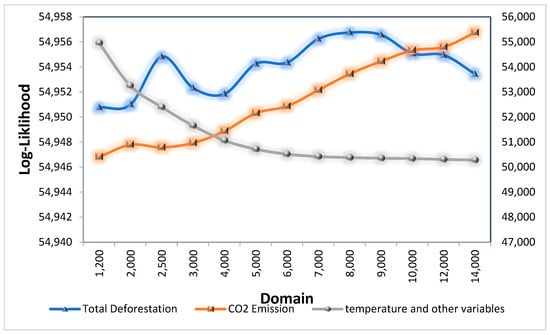 The sensitivity of the estimation results for weight matrices in different regional domains. Initially, we examined the model’s sensitivity to modifications in the weight matrix associated with the air temperature variable. Consistent with our prior tests, this variable demonstrated maximum log-likelihood within a 2000 km radius. Subsequently, we amplified the weights matrix for greenhouse gas emissions to maintain the territory’s stability covered by the variable size weights matrix at the 2000 km level. As illustrated in Figure 5, the most optimal weight matrix for this variable is observed within a 14,000 km radius, highlighting the global impact of this variable on temperature adjustments across regions. Following this, we expanded the territory covered by the deforestation weight matrix while holding the radius of greenhouse gas emissions constant at 14,000 km. The outcomes revealed that the effects of this variable manifest within an 8000 km radius, underscoring the global dimensions of its influence.