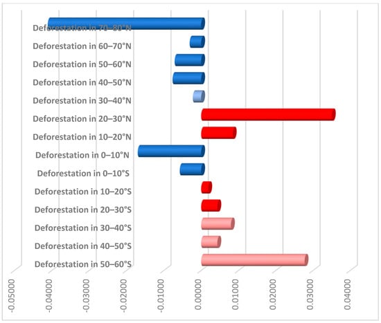 The marginal effects of total deforestation across various geographical latitudes. Analyzing the data presented in Table 5, it is evident that deforestation’s impact on temperature variations is not significant across some latitudes designated in shades of pale blue and red. Meanwhile, the results illustrate minimal deforestation activity between latitudes 30° S and 60° S. This restricted range of observations could potentially elevate the variance of the estimated coefficients, rendering them insignificant. Conversely, the latitude range of 30° N to 40° N does not exhibit these limitations, and its meaningless coefficient should be the natural result of the lack of effect of deforestation on global temperature.
