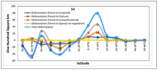 In Table 6, we delve into a more detailed examination, assessing the consequences of deforestation and the conversion of forested land to various non-forest land types, again across different geographical longitudes, estimating 56 models. To achieve our objective, we conducted estimations for 14 models across various latitudes, focusing on four distinct types of non-forest cover. We must highlight that we report only the significant effects observed at each latitude. Analyzing the data from latitudes between 10 degrees south and 10 degrees north reveals that transforming forests into croplands, grass/shrublands, and areas with sparse or no vegetation significantly reduces temperatures. Notably, the shift from forest to sparse or no vegetation, enhancing the albedo effect, results in a more pronounced temperature drop. However, Figure 7 indicates that such transformations to sparse vegetation are minimal within this specific latitude range. Moreover, while forest-to-pasture conversions are the second most common, their impact on temperature variation is not markedly significant.