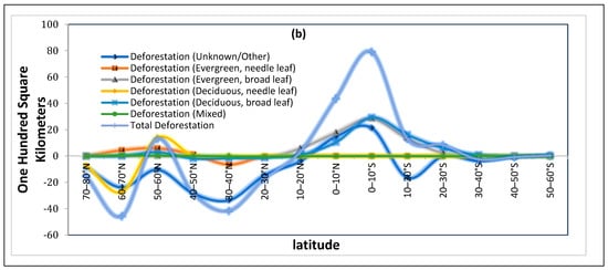 (a) Cumulative deforestation from 1970 to 2019 across various geographical longitudes. (b) Cumulative deforestation from 1970 to 2019 for different forest types across various geographical longitudes. Afforestation efforts have been observed at the northern latitudes, contrasting sharply with significant deforestation activities at the lower latitudes. The extent of deforestation reaches its zenith at latitudes between 10 degrees south and 10 degrees north.