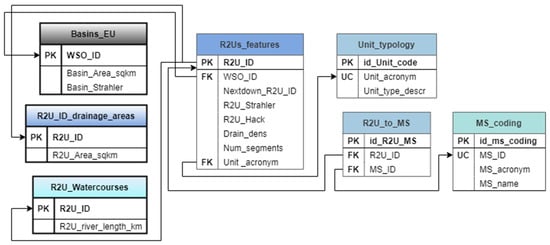 Diagram of the River Restoration Units (R2Us) database [13]. The diagram portrays three spatial layers (Basins_EU, R2U_ID_drainage_areas, and R2U_Watercourses) and four exclusively tabular data elements (R2U_features, Unit_typology, MS_coding, and R2U_to_MS_ID). For more details on each attribute of these elements, please see the full description in Table 1. PK—Primary key; FR—Foreign key; UC—Unique constraint.