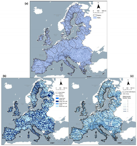 Maps representing (a) the drainage area of the River Restoration Units (R2Us), (b) the R2U drainage areas per typology (Large River Units and Small River Units), including the SRU sub-categories, Small River Sea Outlet (SRSO) and Large River Head Unit (LRHU) and (c) the R2U watercourses per maximum Strahler stream order in the R2U. Basins are represented per polygons with black outlines and no fill color.