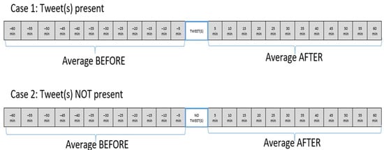 We analyzed two types of situations (depicted in Figure 1): firstly, we created measures for the one-hour intervals before and after each five-minute time interval when Twitter posts took place, and secondly, we analyzed all cases of 125 min time frames surrounding five-minute intervals where no tweets were posted. Comparisons of these two situations allowed us to extract information about the impact of the presence of tweets.