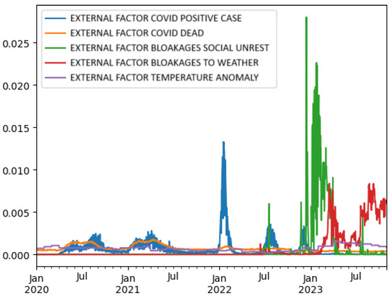 Figure 1 illustrates the trends of various external factors, including COVID-19 cases (positive and dead), social unrest, road blockages due to social unrest and weather, and temperature anomalies. Peaks in certain factors, such as COVID-19 cases and social unrest, were visible during specific periods, indicating their significant occurrence and potential impact on other events or systems.