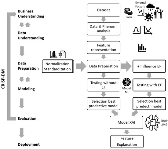 To evaluate the influence of EF on credit risk, we adopt the Cross-Industry Standard Process for Data Mining (CRISP-DM), a widely used framework that structures data mining projects into six iterative stages: Business Understanding, Data Understanding, Data Preparation, Modeling, Evaluation, and Deployment [43]. This methodological foundation provides a robust and flexible structure for guiding machine learning workflows across domains, and has also been successfully applied in prior studies analyzing external factors during crisis scenarios [44,45].