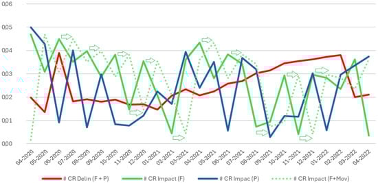 Figure 3 depicts the impact of COVID-19 on economic activities by comparing delinquency rates with the economic impacts over time. The graph highlights fluctuations in economic impact trends, particularly during pandemic peaks, and distinguishes patterns between financial and personal impacts (F + P) and movement-related impacts (CR Impact F + Mov).