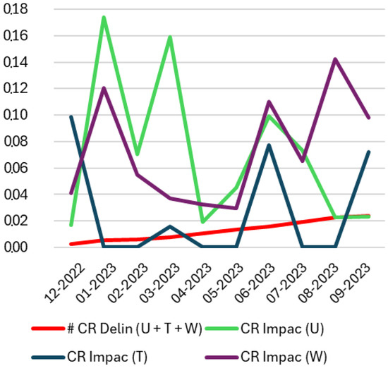 Figure 4 illustrates the impact of social unrest and climatic factors on economic activity from December 2022 to September 2023. It compares delinquency rates with the economic impact of social unrest, weather, and temperature anomalies, and shows significant spikes during periods of intensified external disruptions.