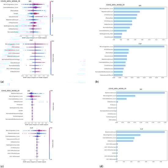 To assess the influence of external stressors on credit risk, multiple experimental scenarios were constructed using different combinations of observed external factors (see Table 6). These include a baseline scenario SFE, as well as scenarios incorporating COVID-19-related metrics such as fatalities (F), confirmed positive cases (P), and a combined F + P scenario. Additionally, a variation labeled COVID MOV was considered, shifting fatality data forward by one month to account for incubation and reporting delays.