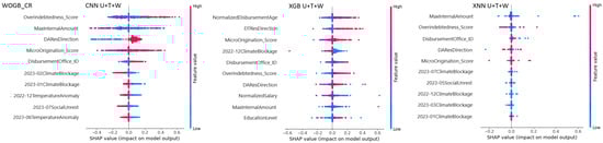 - Evaluation and Explainability (XAI): Models were evaluated using metrics such as Accuracy (ACC), Area Under the Curve (AUC), Kolmogorov–Smirnov (KS) and F1-score (F1) across multiple folds (10-fold cross-validation). To enhance interpretability, post hoc explainability techniques such as SHAP and LIME were applied [52]. These methods highlight the most influential features in predicting credit delinquency both before and after incorporating EF [19].