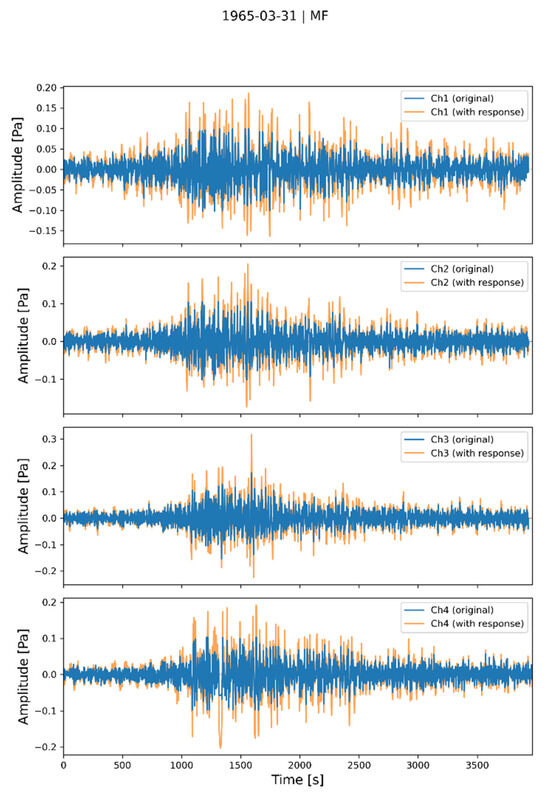 Example overlay plots for the 31 March 1965 event at station MF. Each panel corresponds to one channel, showing the original (blue) time–amplitude waveform superimposed with its instrument-corrected (orange) counterpart (see Section 4 for details). Amplitude is plotted against time, with the zero of the time axes indicating the start of the recording rather than a calibrated UTC.