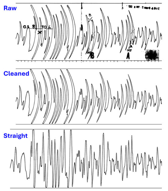 Representative example of the image-processing workflow used to prepare historical strip-chart records for digitization. The top panel (“Raw”) shows the original high-resolution scan, including operator annotations and administrative markings. The middle panel (“Cleaned”) has these extraneous elements removed, clarifying the primary waveform. The bottom panel (“Straight”) depicts the final corrected trace, wherein geometric distortions have been rectified to facilitate accurate amplitude extraction and digitization.