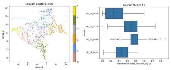 For exploratory data analysis, Principal Component Analysis (PCA) with default parameters was applied to the scaled dataset, and the results were visualized in the coordinates of the first two principal components, which captured the highest variance []. To determine the optimal number of clusters for K-means clustering, the elbow method and the Davies–Bouldin index were used []. The K-means algorithm from scikit-learn 1.2.0 was then executed 1000 times with six clusters, using the k-means++ initialization method, a maximum of 300 iterations, and 10 different initializations. A consensus matrix was computed by aggregating clustering results across iterations []. To assess the presence of a well-defined block structure at the specified number of clusters, a clustermap was generated using seaborn, visualizing the distance matrix, defined as one minus the consensus matrix. If necessary, the number of clusters was adjusted based on these results. To further refine clustering, a graph representation was constructed from the consensus matrix using NetworkX 3.4.2 []. Nodes representing consolidated super-enhancer loci were clustered using the Louvain algorithm, which optimizes modularity to identify community structures. For dimensionality reduction, the scaled signal matrix was projected into two dimensions using Uniform Manifold Approximation and Projection (UMAP, v0.5.7) [] with default parameters. The resulting UMAP coordinates were used to visualize consolidated SE loci, with coloring corresponding to Louvain cluster assignments. To associate consolidated loci with reference genes, we selected the closest active gene as indicated in SEdb 2.0.