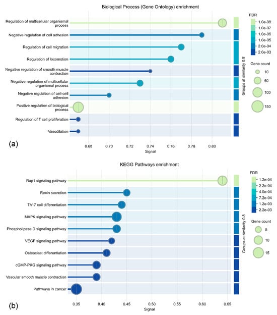 The dataset also includes functional annotations for each SE locus, facilitating downstream analyses of gene regulation. For example, Figure 2a presents GO enrichment analysis for biological processes within the protein–protein interaction network, while Figure 2b depicts enriched KEGG (Kyoto Encyclopedia of Genes and Genomes) pathways. By correlating SE activity patterns with these functional pathways, researchers can identify key regulatory elements potentially involved in oncogenic processes or treatment responses. This level of functional insight is particularly valuable for detecting disease-relevant enhancers that might be overlooked by strictly binary classification approaches.